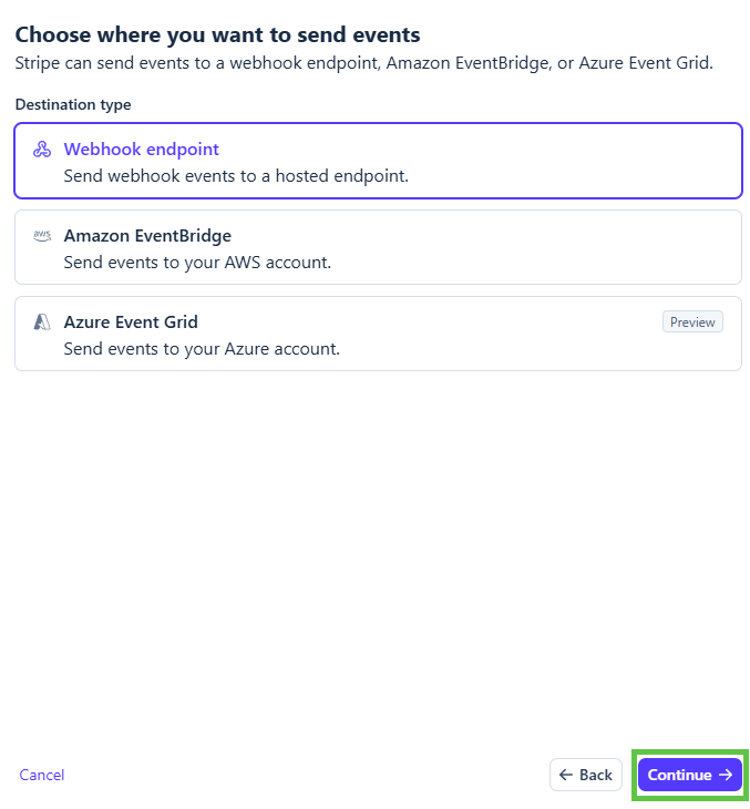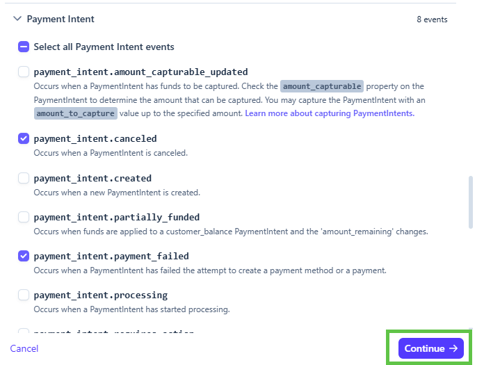 You must select the specific event types the system needs to process. For a standard setup, ensure you select payment_intent.succeeded for successful payments, payment_intent.payment_failed for failed payments, and payment_intent.canceled for canceled payments. Now click Continue.