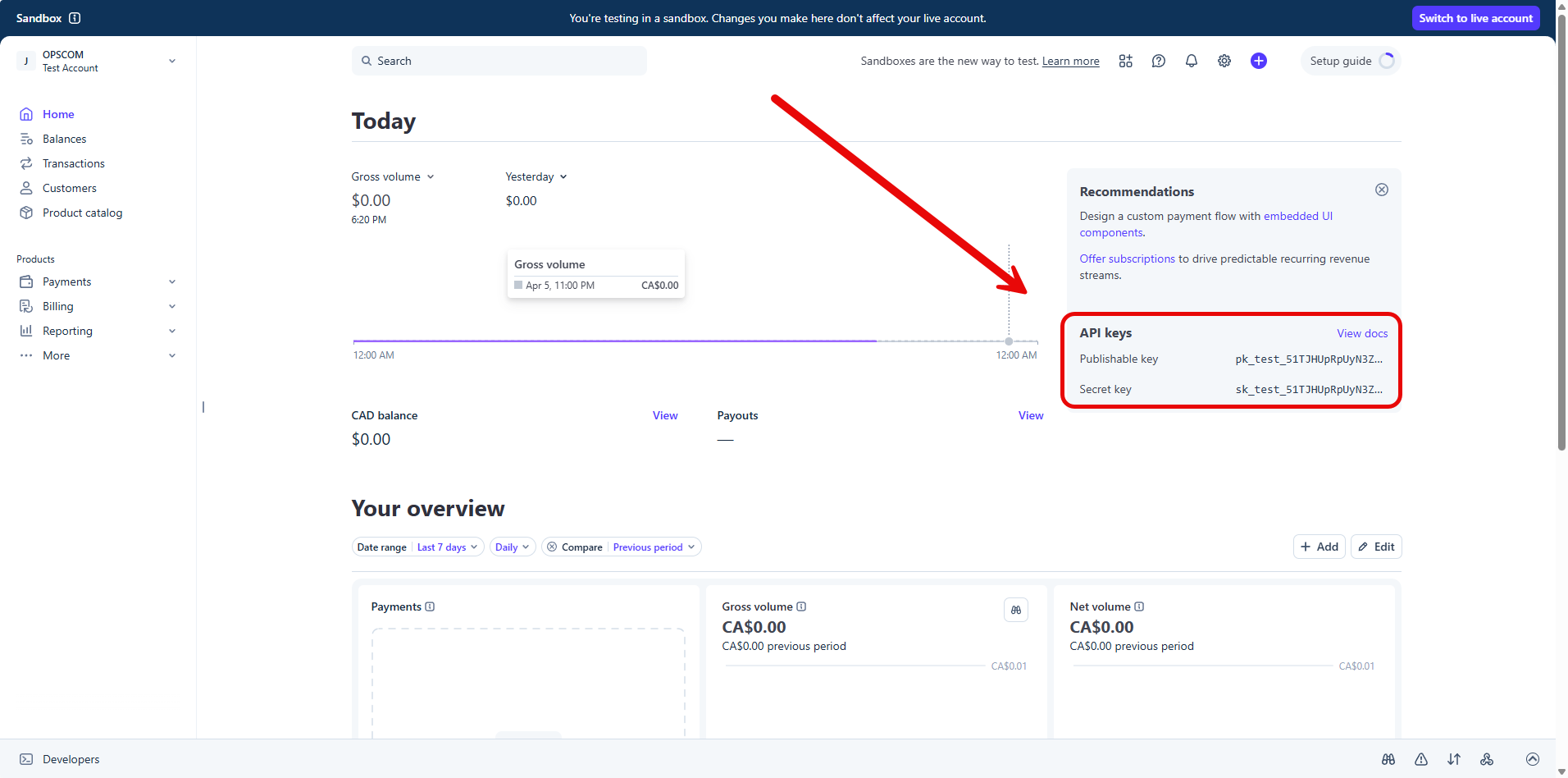 Now, you have to get the API keys for your Stripe account, and setup webhooks, which can be found on the stripe dashboard, which you should be logged into, from a previous step. Your Publishable Key, and Secret Key, can be found and copied here. You can click on these values to copy them, and paste them into the payment type settings in OPSCOM.