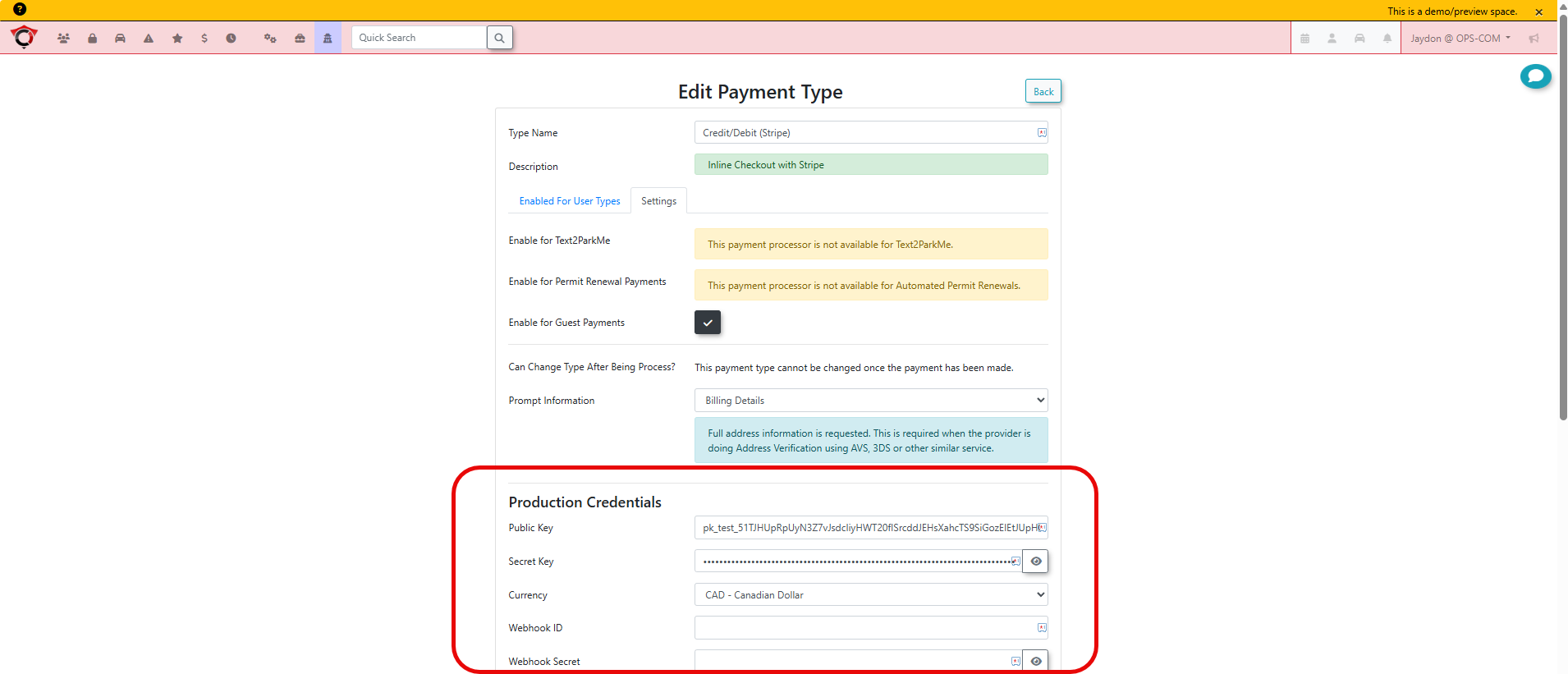 To begin the integration, an administrator must setup a payment type in OPSCOM, with will be linked to their Stripe account. This is handled through the central administration portal where you will input your unique credentials.