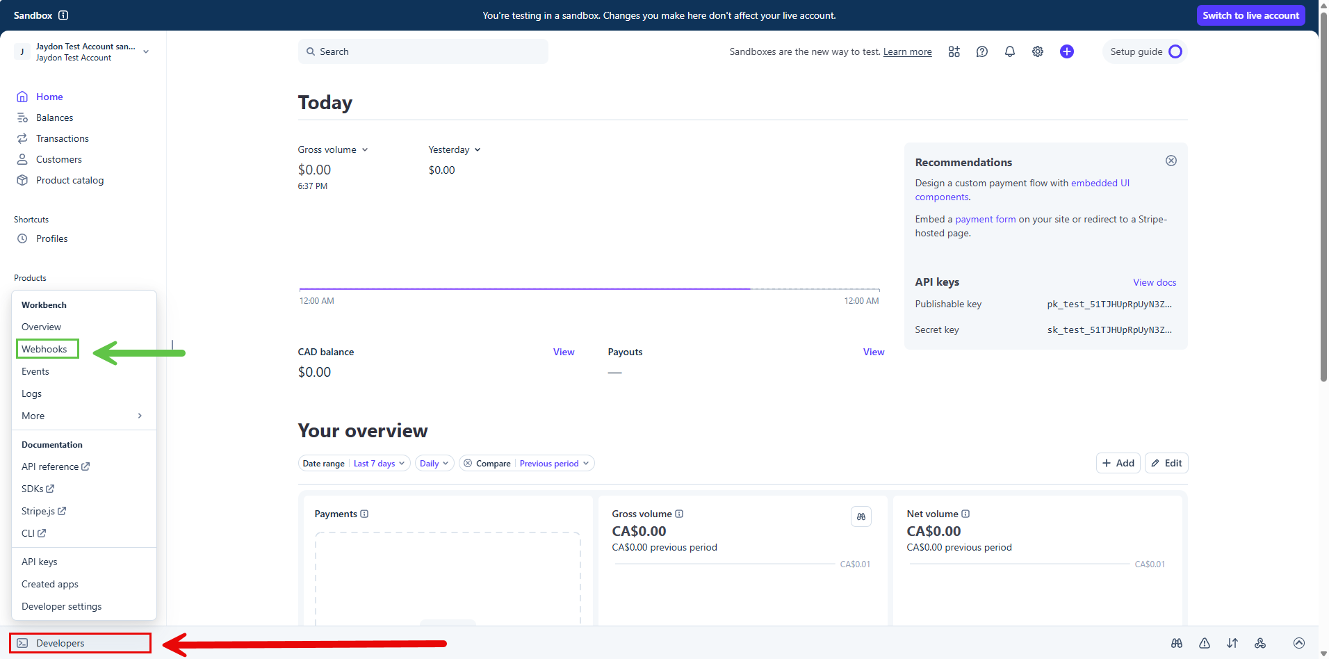 To begin receiving notifications, you must define where Stripe should send transaction data. In your Stripe Dashboard, click on Developers (bottom left) and select Webhooks.