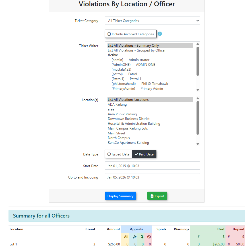 The Violation Summary by Location / Officer screen is displayed. Select your date parameters for the search, and select whether the date you enter is for the violations Issued date, or the violations Paid date (all unpaid will be excluded):