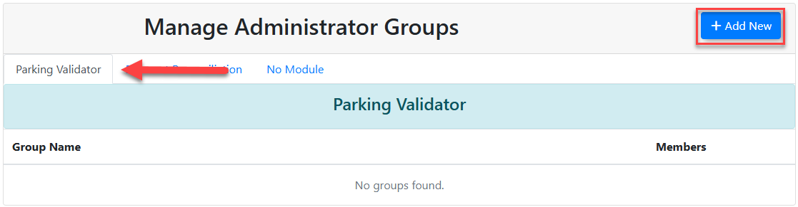 3. To create a Validator group click on the Parking Validator module and then click Add New in the top right corner under.